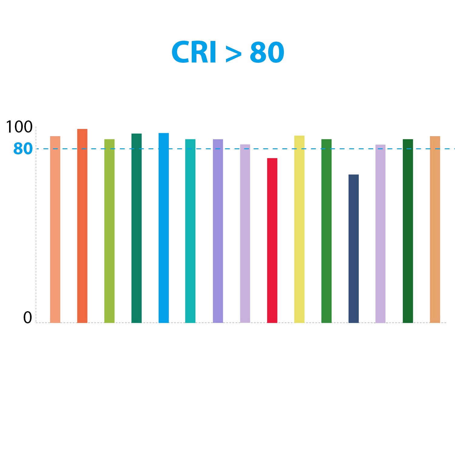 Der Farbwiedergabeindex des Lichts liegt bei über 80, was bedeutet, dass Ihre Raumfarbe 80% so lebendig wie bei Sonnenlicht erscheint.